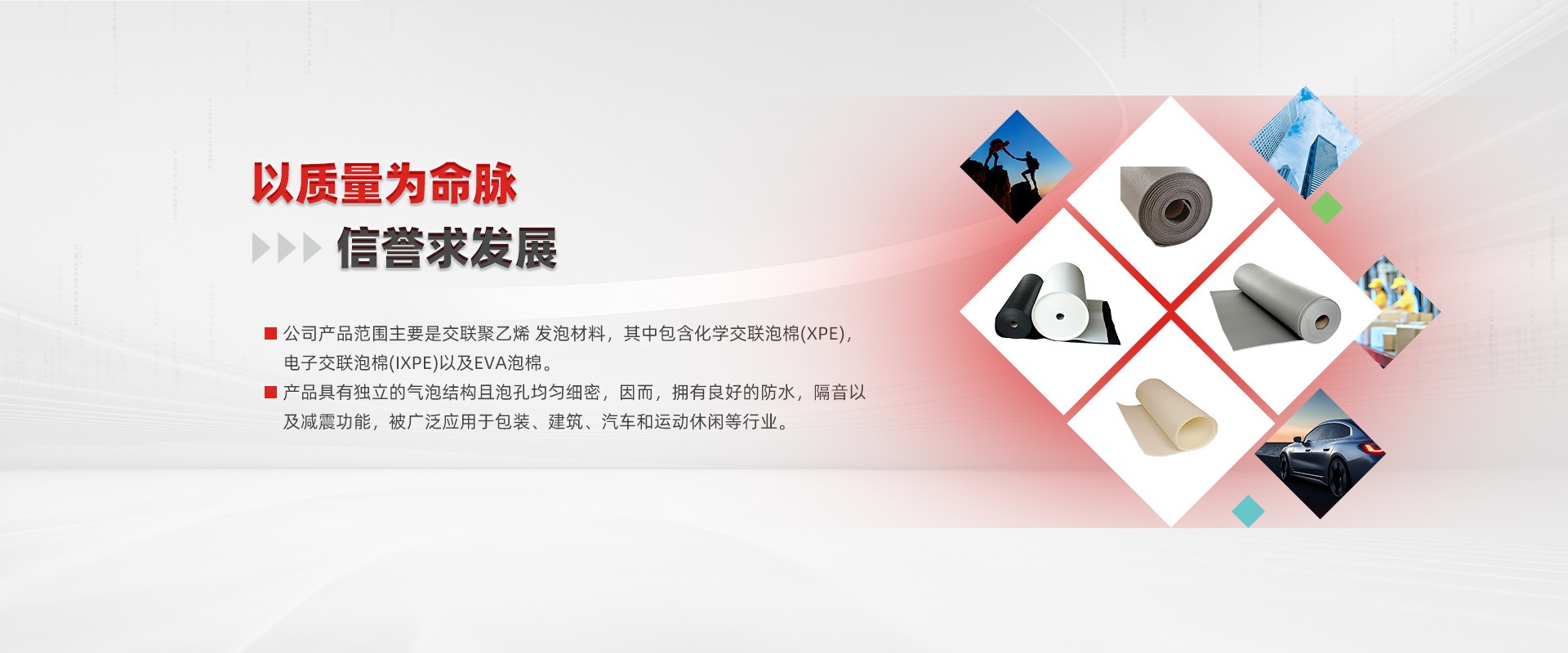 公司产品范围主要是交联聚乙烯 发泡材料,其中包含化学交联泡棉(XPE),电子交联泡棉(IXPE)以及EVA泡棉。产品具有独立的气泡结构且泡孔均匀细密,因而,拥有良好的防水,隔音以及减震功能,被广泛应用于包装、建筑、汽车和运动休闲等行业。